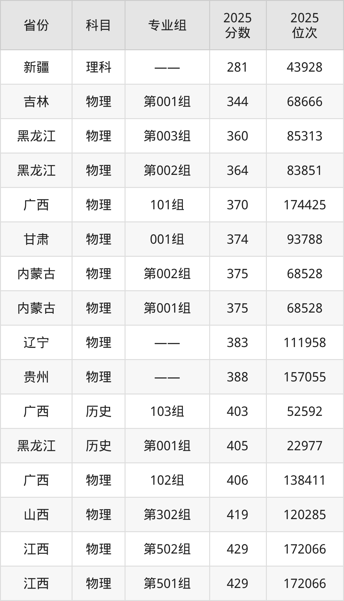 理科:2025年黑龙江东方学院录取最低分是281分(新疆),对应的位次排名是43928名。