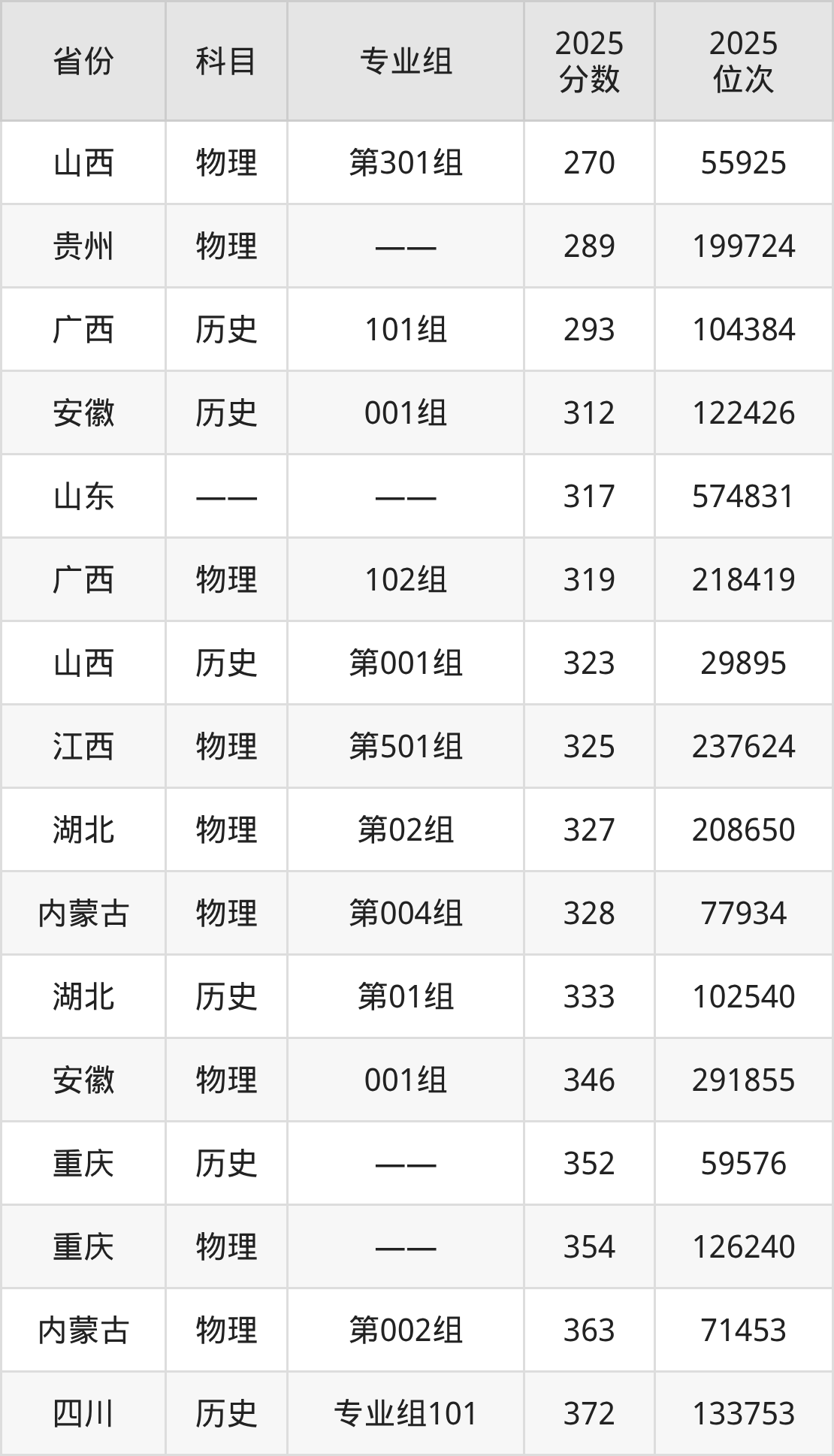 物理类:2025年平顶山工业职业技术学院录取最低分是270分(山西),对应的位次排名是55925名。