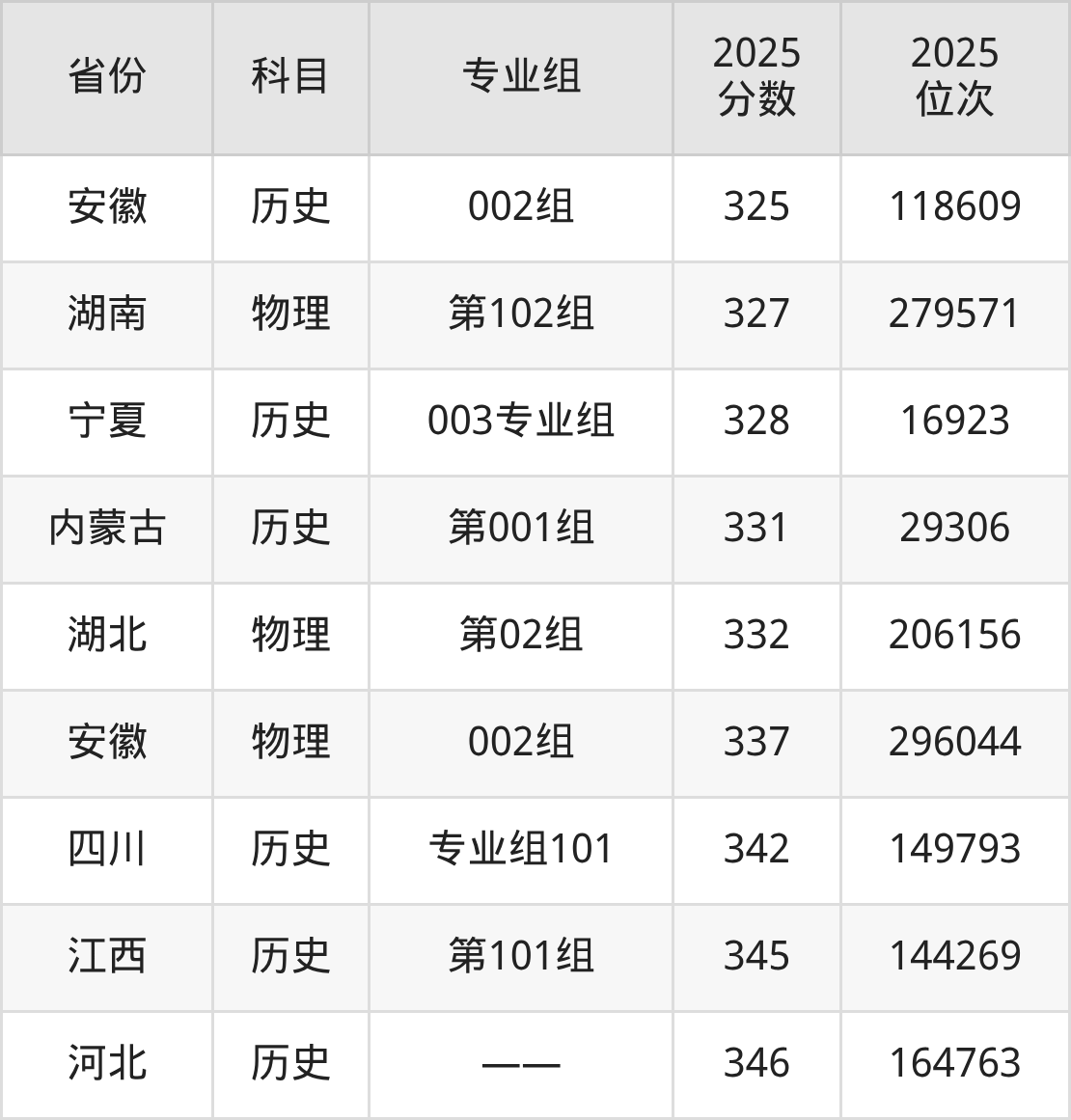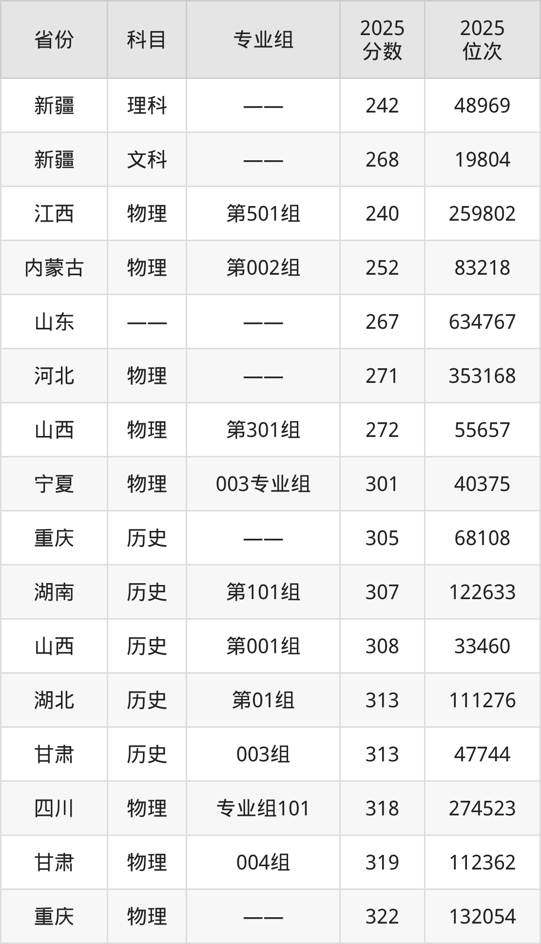 物理类:2025年新疆石河子职业技术学院录取最低分是240分(江西),对应的位次排名是259802名。