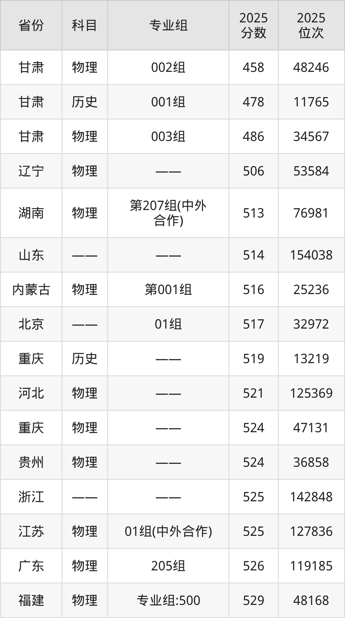 2025年东莞理工学院全国排名第138位,2025年录取分数线最低458分(位次48246)。本文将展示东莞理工学院在各省最低录取分数线汇总,供2026届想要报考该校的考生查阅。