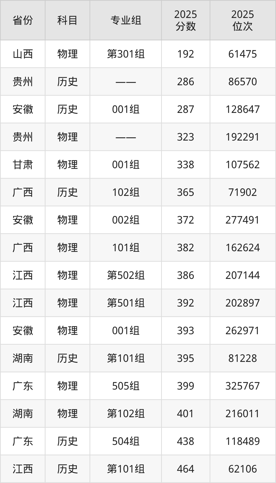 物理类:2025年中山火炬职业技术学院录取最低分是192分(山西),对应的位次排名是61475名。