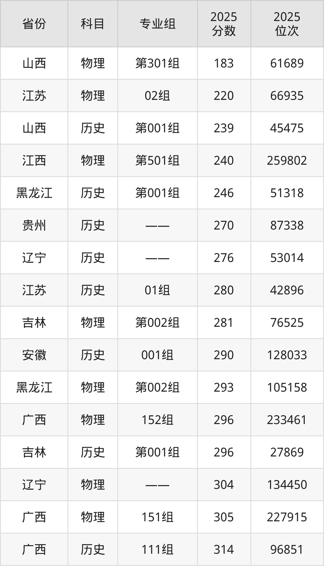 物理类:2025年广西物流职业技术学院录取最低分是183分(山西),对应的位次排名是61689名。