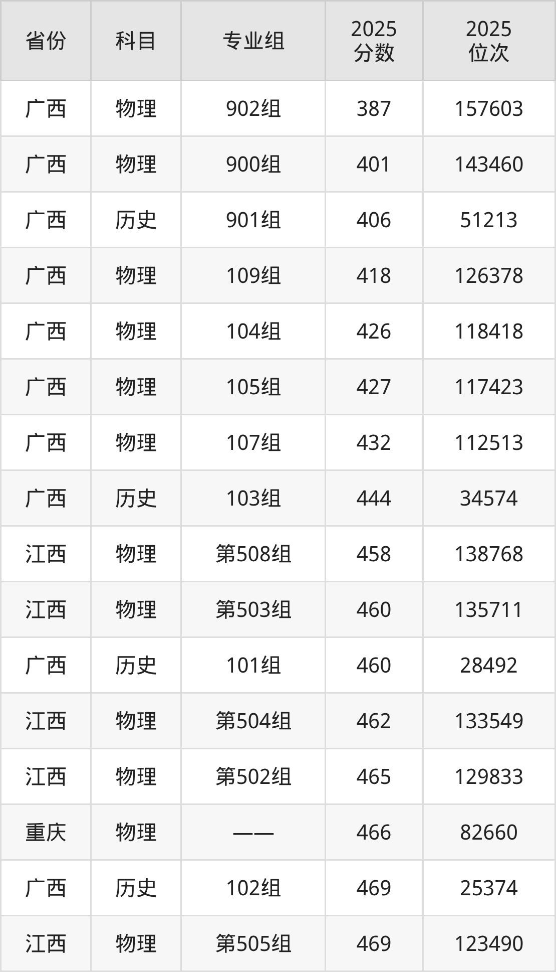 物理类:2025年豫章师范学院录取最低分是387分(广西),对应的位次排名是157603名。