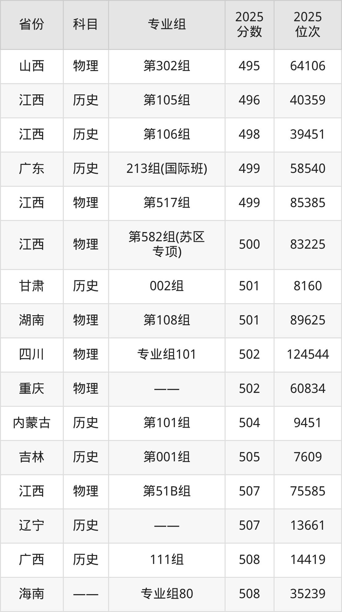历史类:2025年江西科技师范大学省内录取最低分是496分,对应的位次排名是40359名。建议:如果2026年排名超过40359名,那么被该校录取的概率较大。
