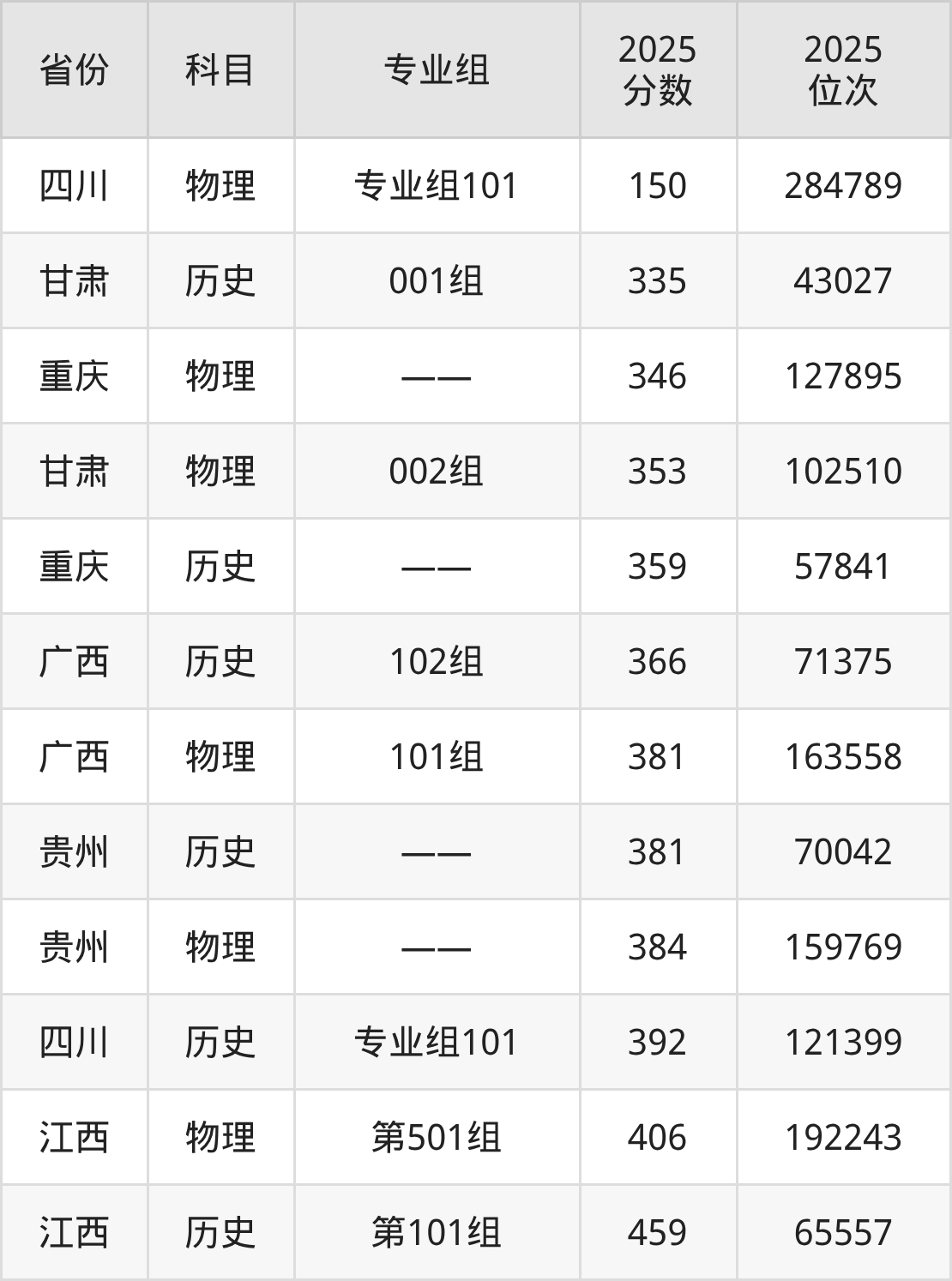 物理类:2025年重庆工贸职业技术学院录取最低分是150分(四川),对应的位次排名是284789名。