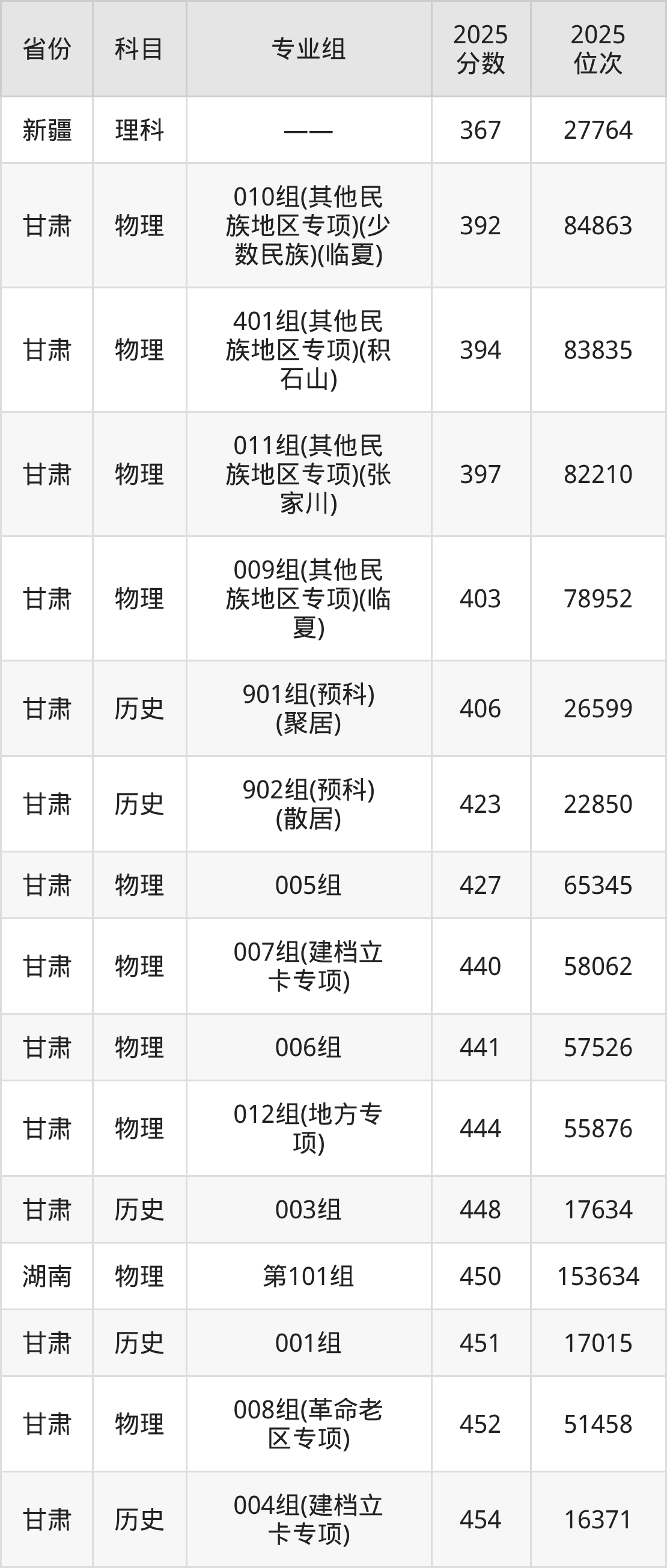 物理类:2025年兰州工业学院录取最低分是450分(湖南),对应的位次排名是153634名。