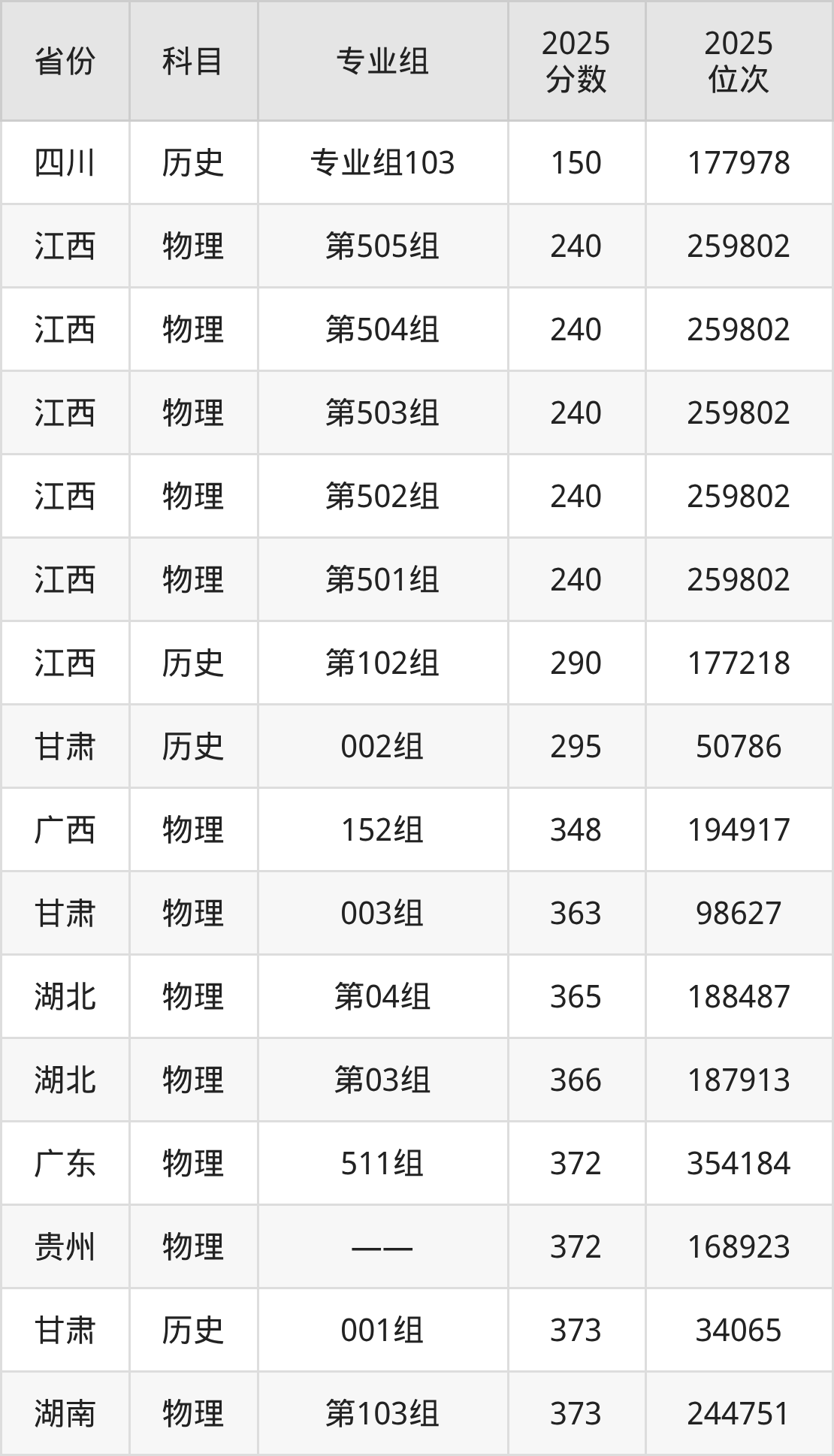 历史类:2025年赣南卫生健康职业学院录取最低分是150分(四川),对应的位次排名是177978名。