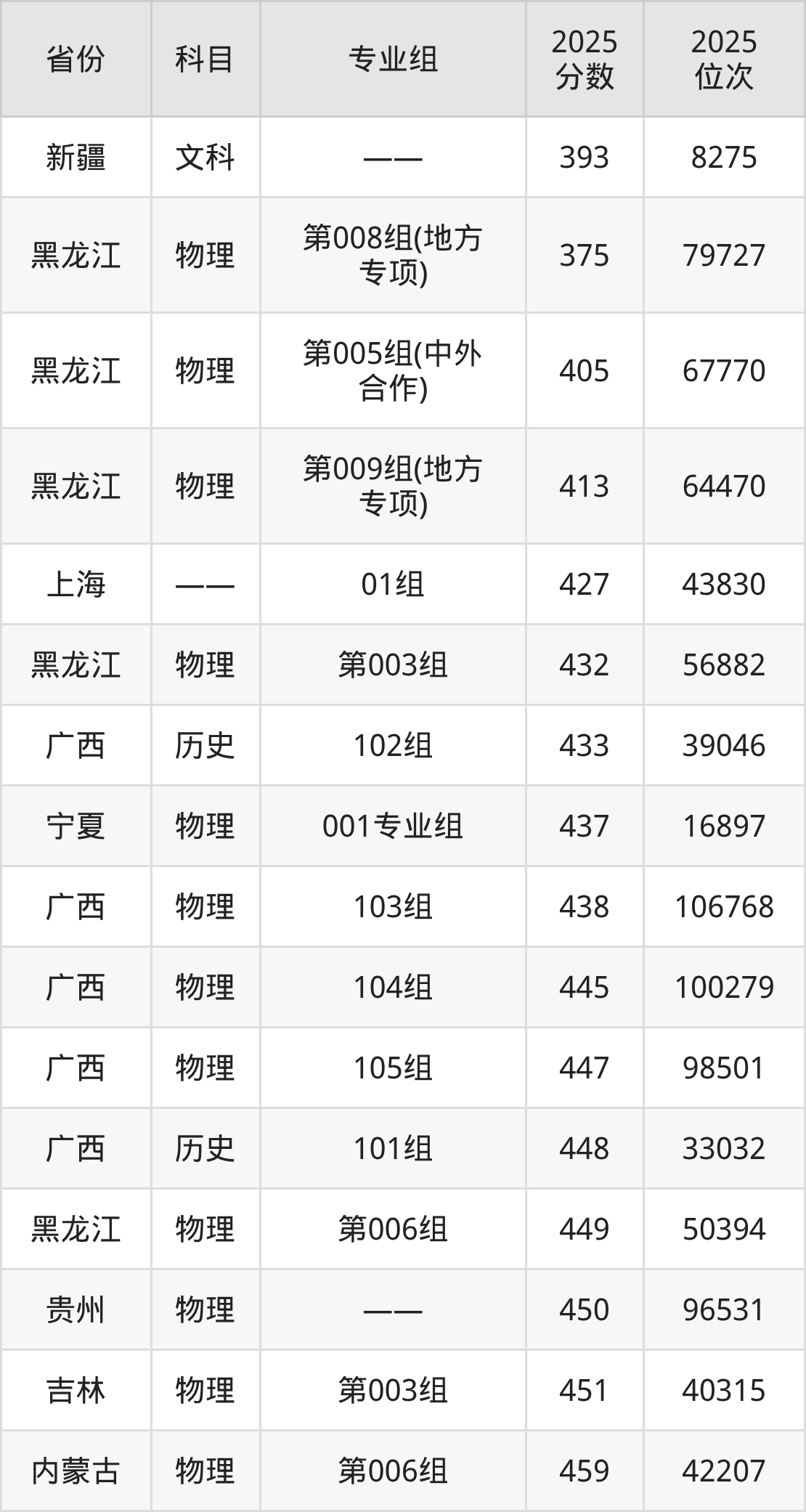 文科:2025年黑龙江科技大学录取最低分是393分(新疆),对应的位次排名是8275名。