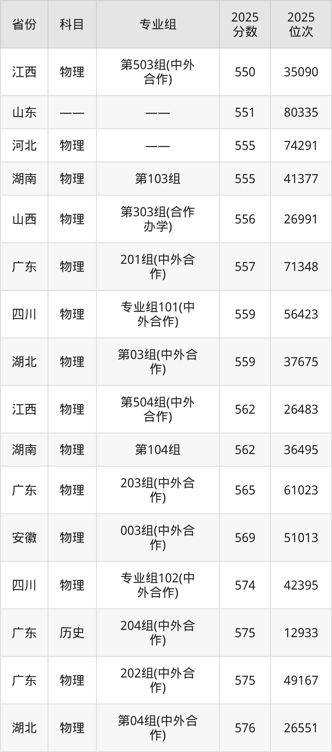 物理类:2025年深圳北理莫斯科大学录取最低分是550分(江西),对应的位次排名是35090名。
