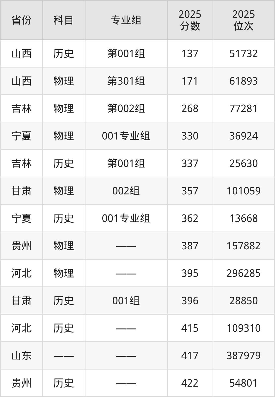 历史类:2025年朔州师范高等专科学校录取最低分是337分(吉林),对应的位次排名是25630名。