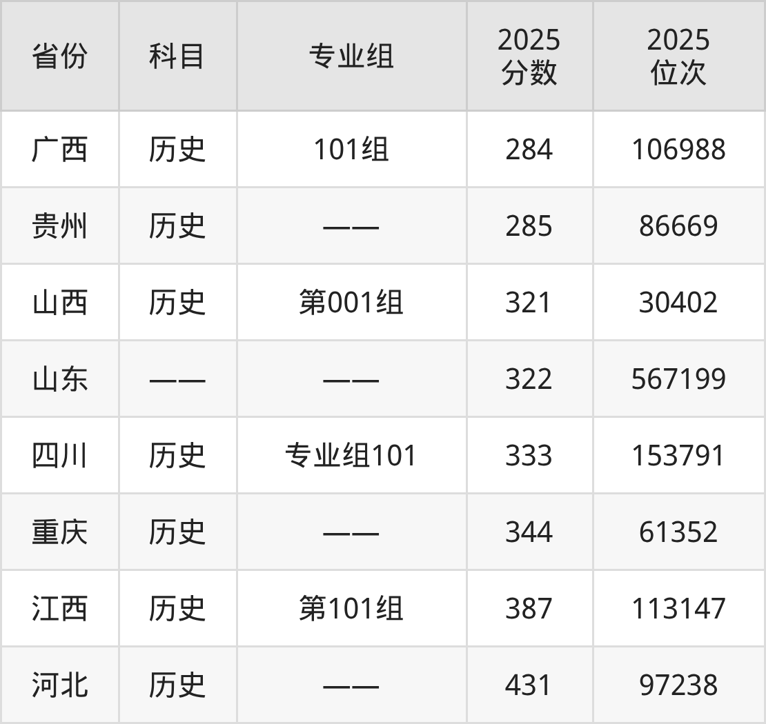 历史类:2025年济南幼儿师范高等专科学校录取最低分是284分(广西),对应的位次排名是106988名。