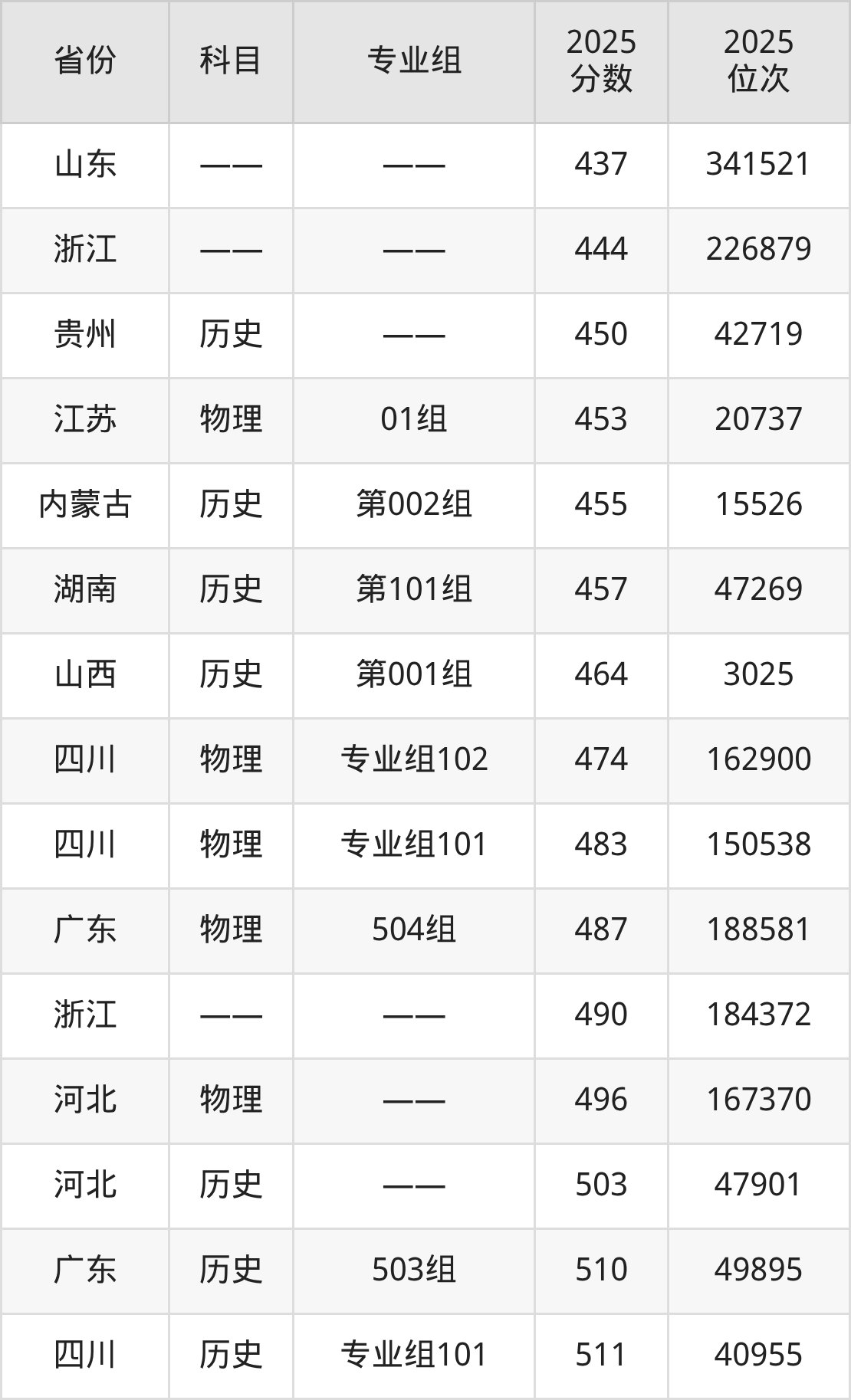 3+3地区:2025年四川交通职业技术学院录取最低分是437分(山东),对应的位次排名是341521名。