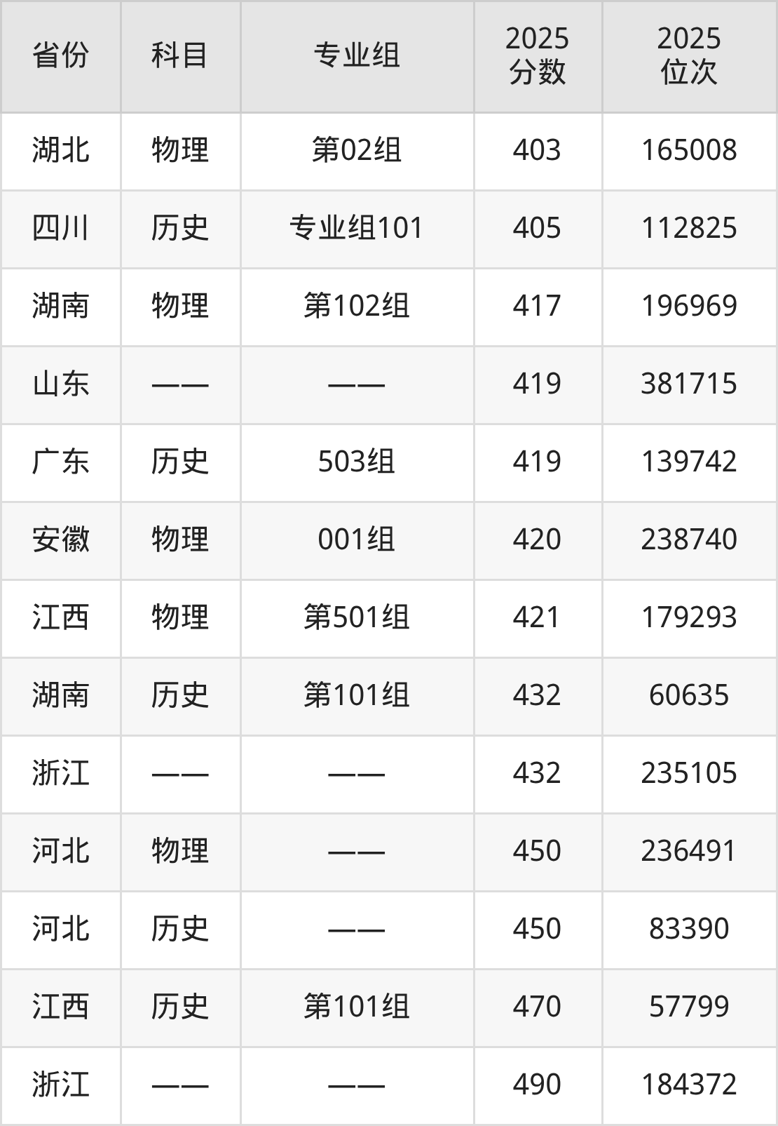 3+3地区:2025年湖南水利水电职业技术学院录取最低分是419分(山东),对应的位次排名是381715名。