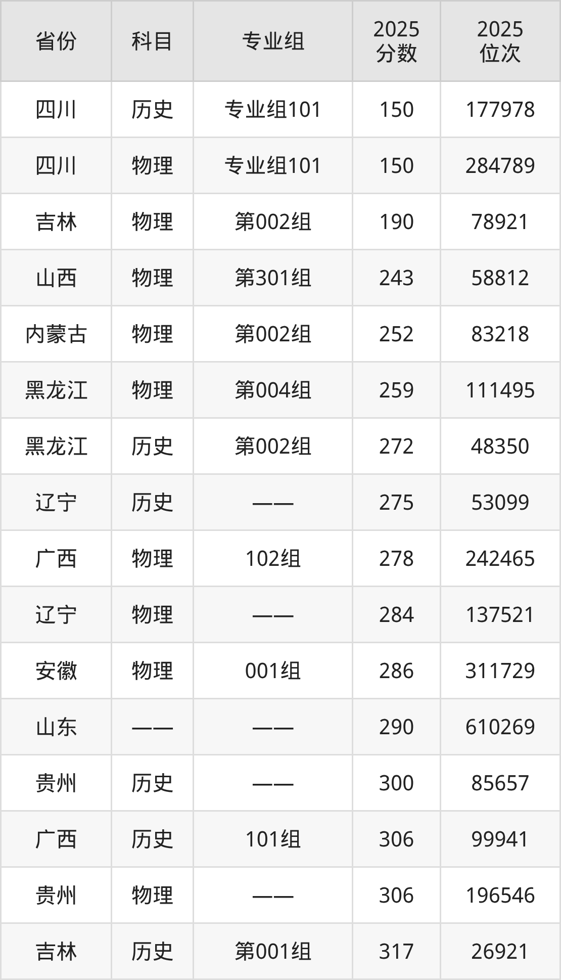 历史类:2025年伊春职业学院录取最低分是150分(四川),对应的位次排名是177978名。