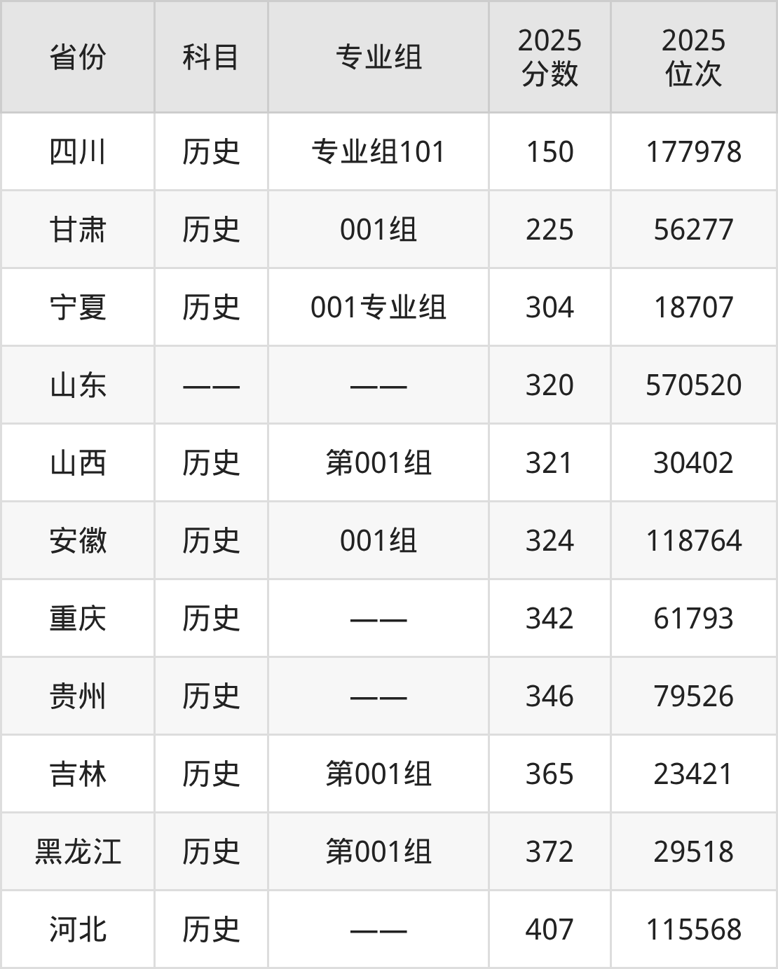 历史类:2025年安阳幼儿师范高等专科学校录取最低分是150分(四川),对应的位次排名是177978名。