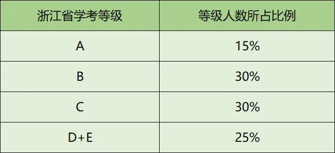 一般来说学考结束后是不会向学生公布具体答案的,只会将成绩以等级的方式展现给学生,这在一定程度上也将减轻统计的工作量和学生的压力。浙江省的学考主要是采用等级制划分,设置了A、B、C、D、E共5个等级,成绩的评定主要是以当次的卷面得分为依据,除了外语满分150,语文和数学100分之外,其余科目满分都为70分。其中A、B、C等级主要按照实考人数的15%、30%和30%进行比例的划定,D和E等级主要按照25%的等级人数划分。