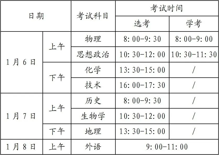 首考主要包含了学考和选考,学考是同学们能否取得毕业证书的关键,而选考则是在学考合格的前提下进行的,所以本次考试的内容对于高中生而言十分重要。以下是科目的具体时间安排: