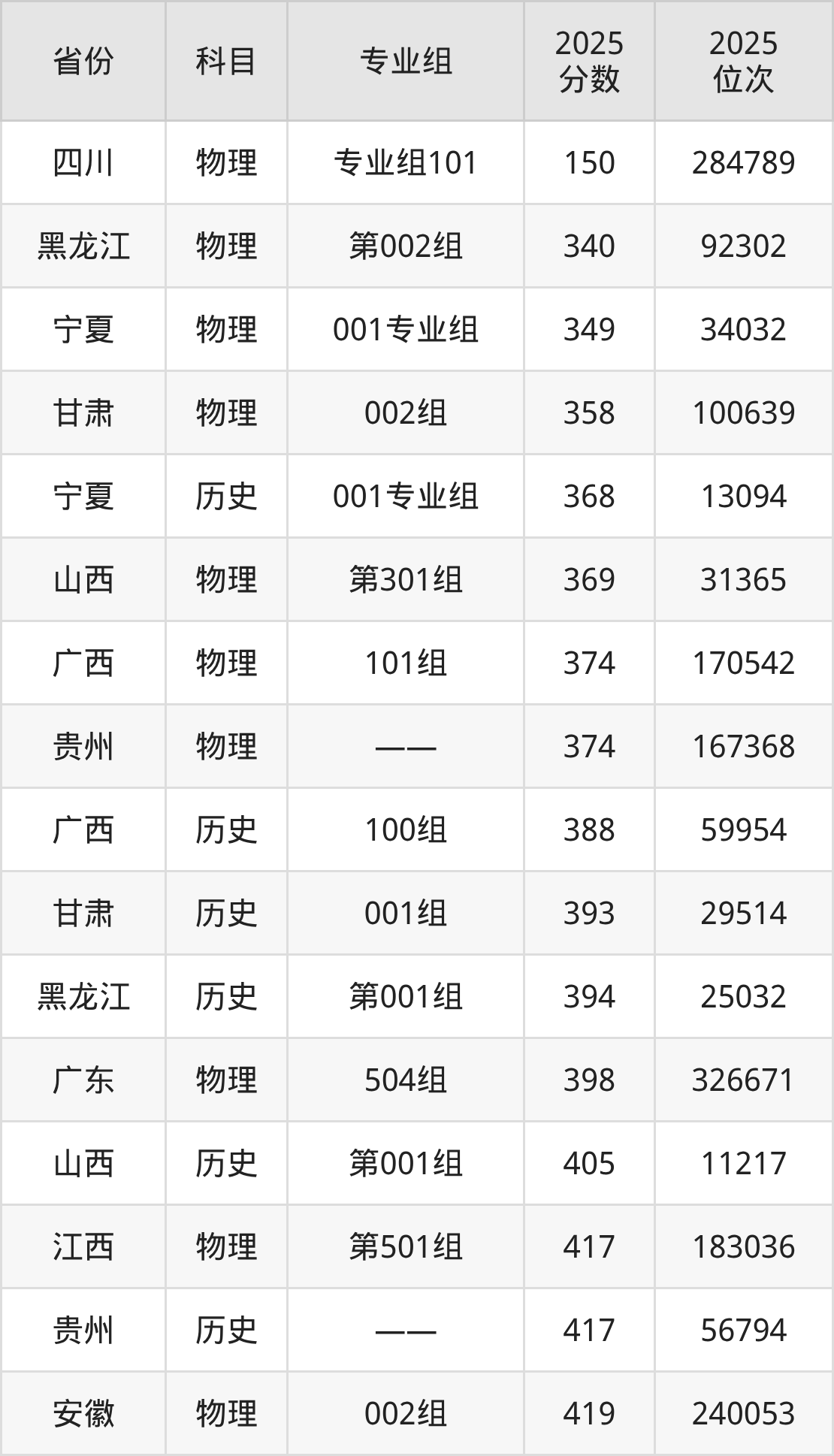 物理类:2025年安庆医药高等专科学校录取最低分是150分(四川),对应的位次排名是284789名。
