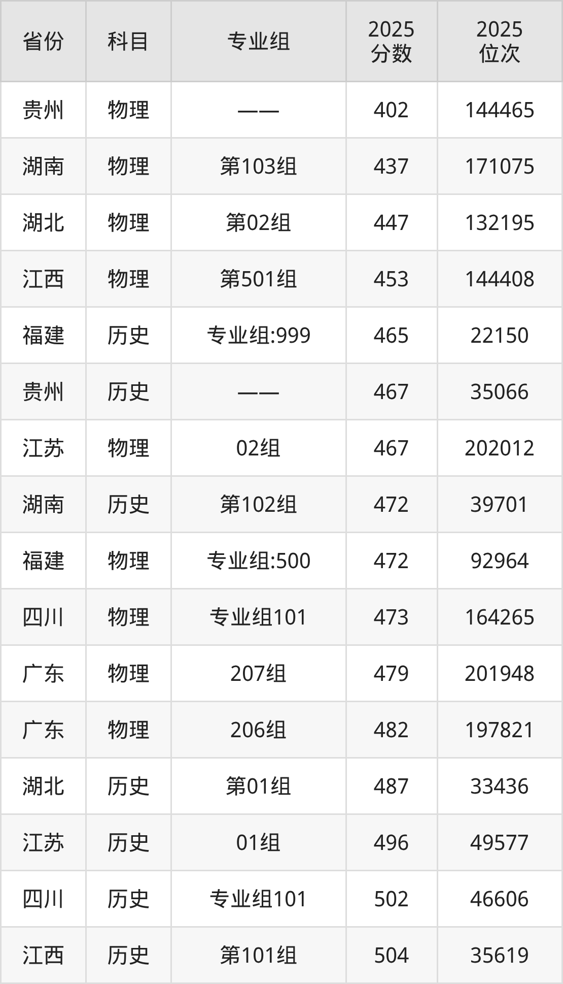物理类:2025年贵阳人文科技学院省内录取最低分是402分,对应的位次排名是144465名。建议:如果2026年排名超过144465名,那么被该校录取的概率较大。