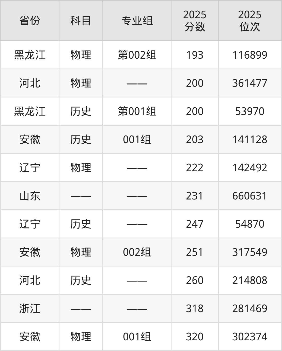 物理类:2025年邢台应用技术职业学院录取最低分是193分(黑龙江),对应的位次排名是116899名。