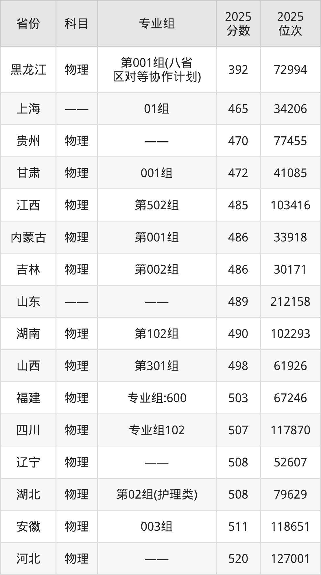 物理类:2025年承德医学院录取最低分是392分(黑龙江),对应的位次排名是72994名。