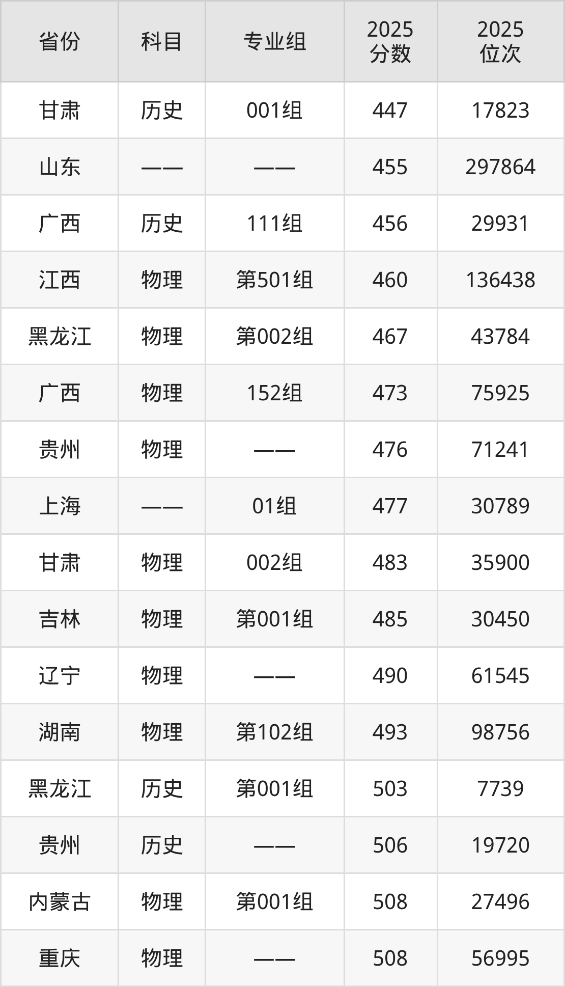 历史类:2025年齐鲁工业大学录取最低分是447分(甘肃),对应的位次排名是17823名。