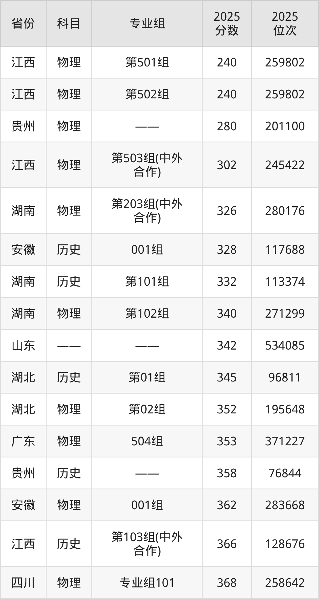 物理类:2025年上饶职业技术学院录取最低分是280分(贵州),对应的位次排名是201100名。