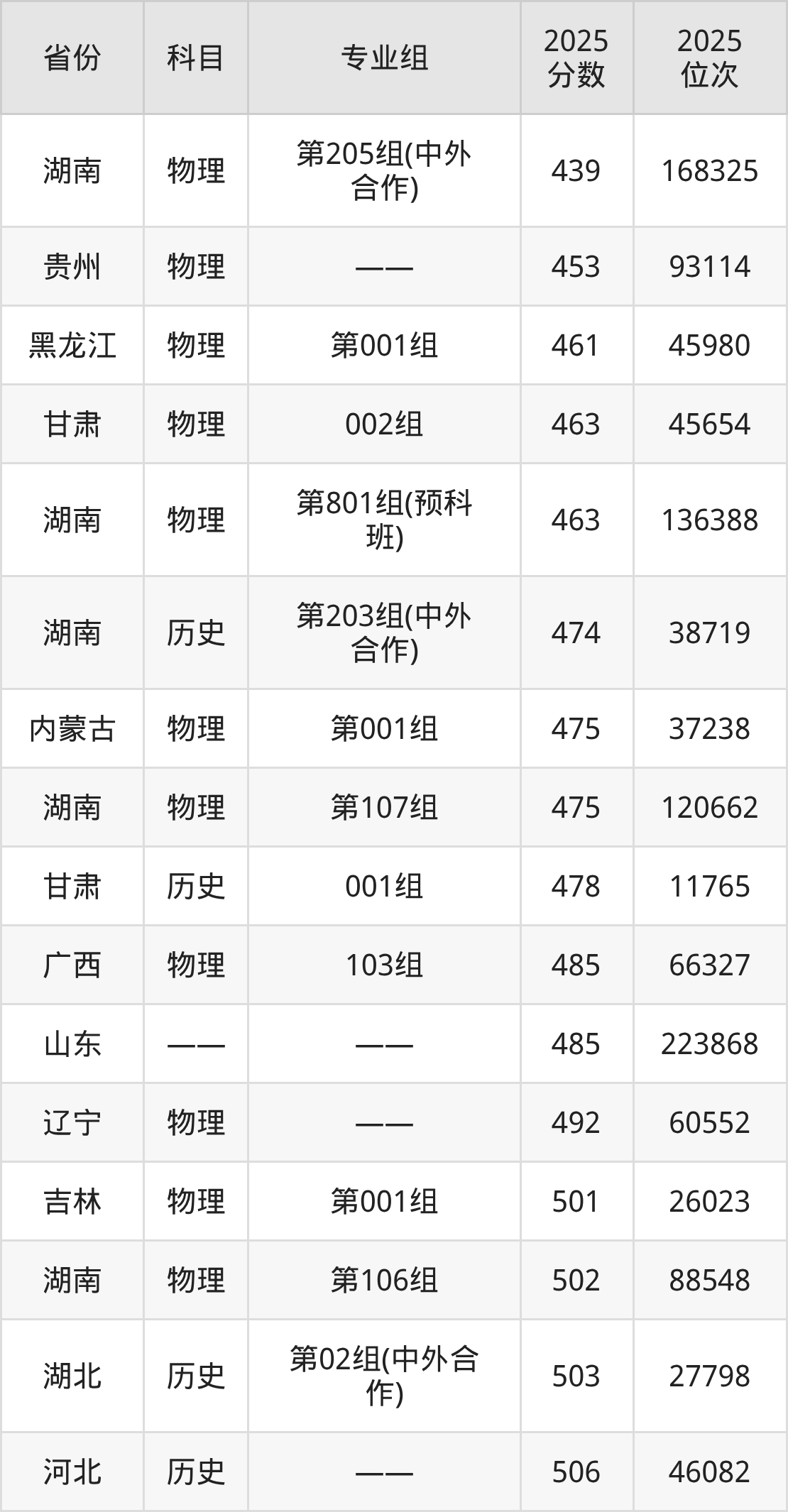 物理类:2025年绍兴文理学院录取最低分是439分(湖南),对应的位次排名是168325名。