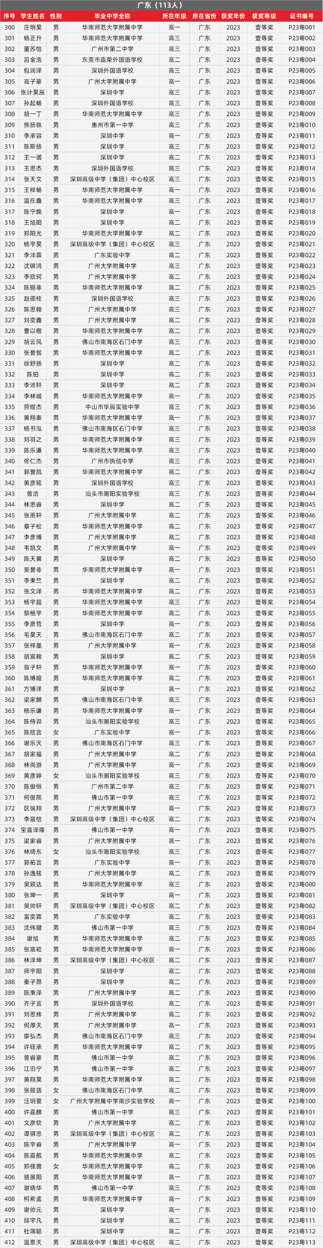 近日,中国物理学会发布2023年省级竞赛一等奖获奖学生信息汇总表(公示)。中国物理学会官网公示2023年第40届全国中学生物理竞赛省一、省二、省三获奖名单,含获奖证书编号。省一2300人、省二9760人、省三10378人,以下为公示名单: