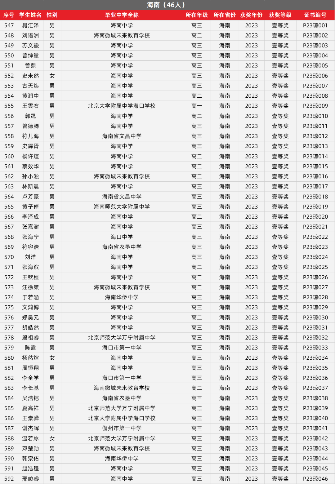 9. 海南物理竞赛获奖名单