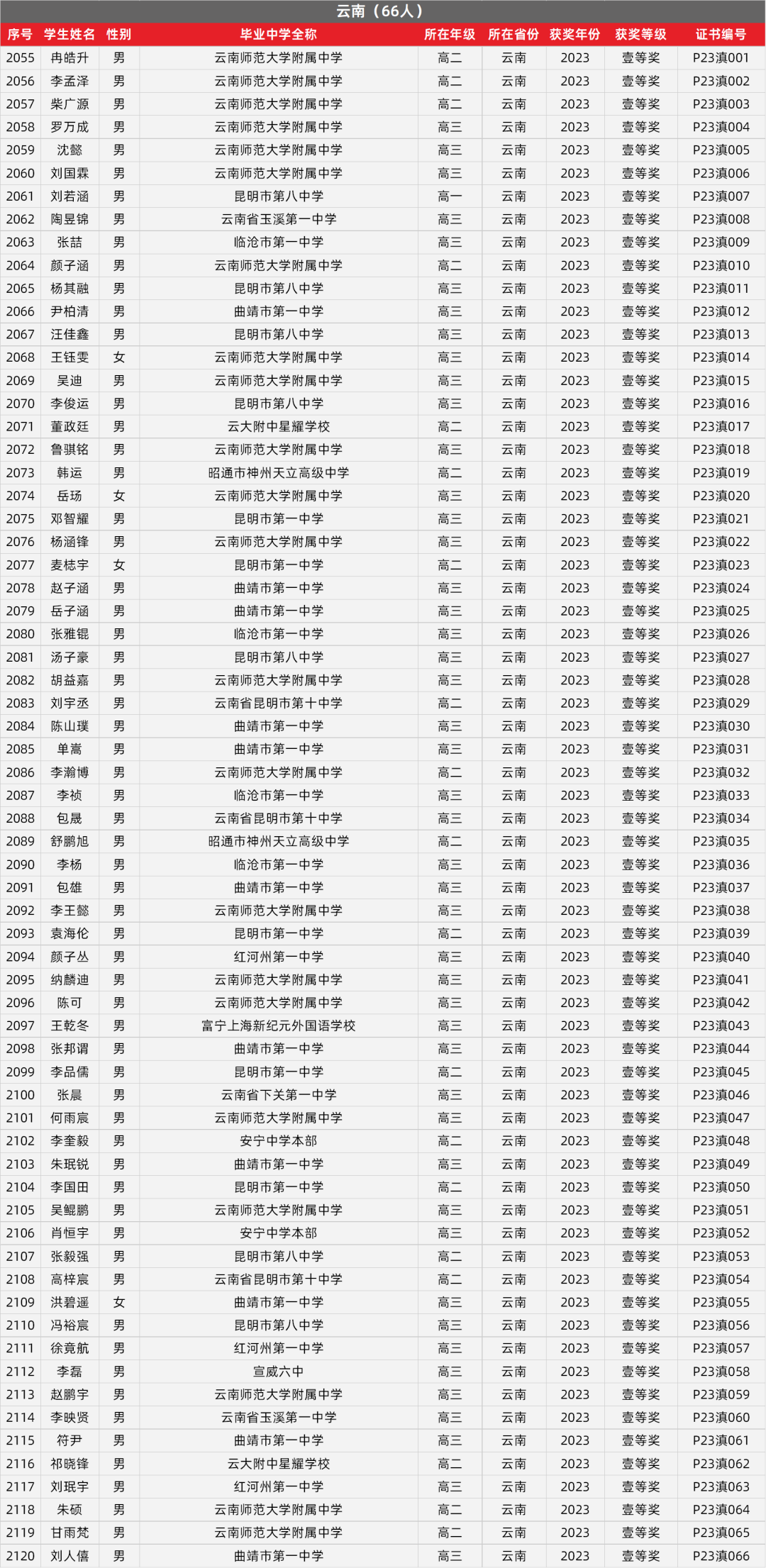 30. 云南物理竞赛获奖名单