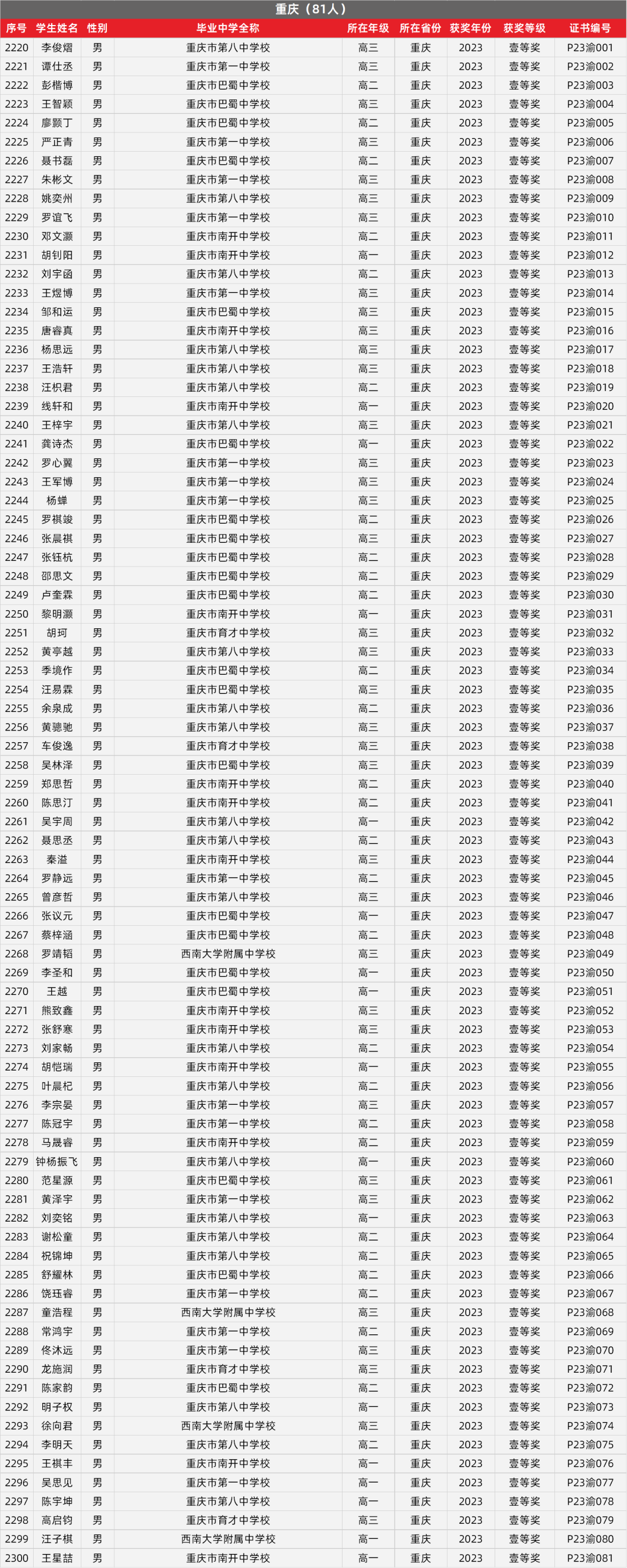 32. 重庆物理竞赛获奖名单