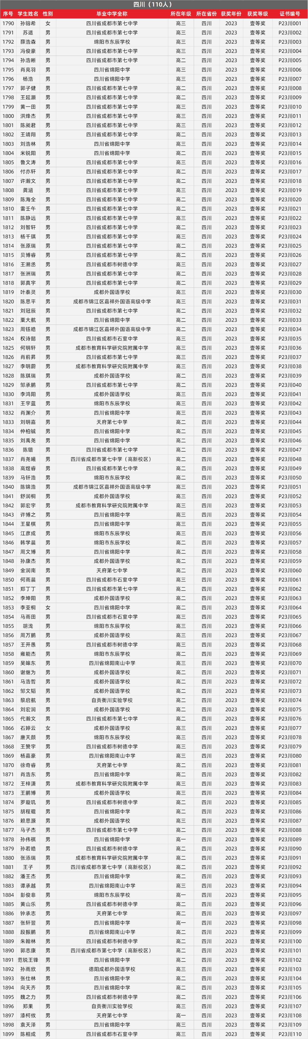 25. 四川物理竞赛获奖名单