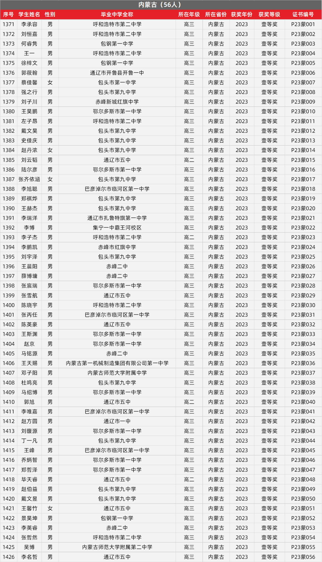 19. 内蒙古物理竞赛获奖名单