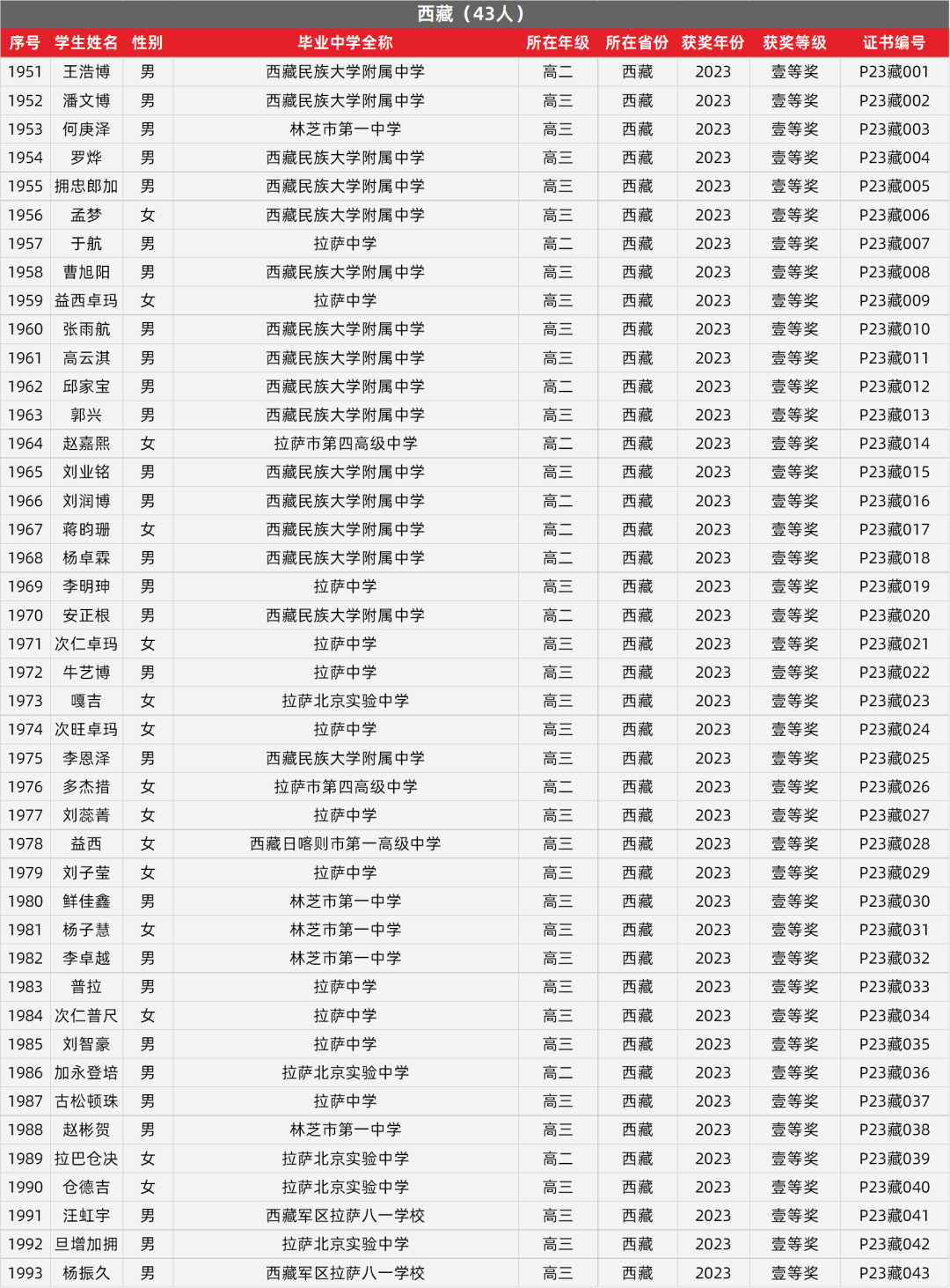 27. 西藏物理竞赛获奖名单