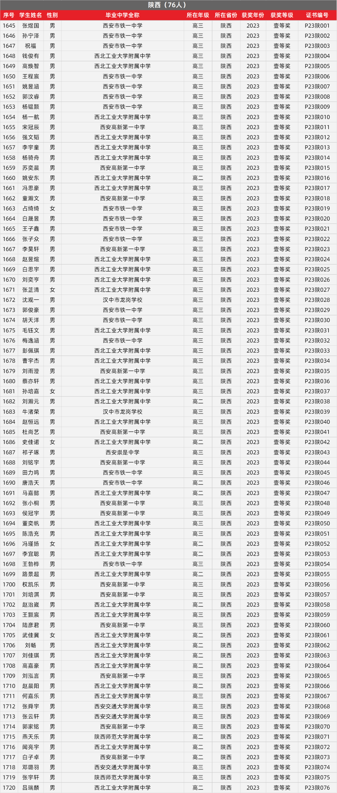 23. 陕西物理竞赛获奖名单