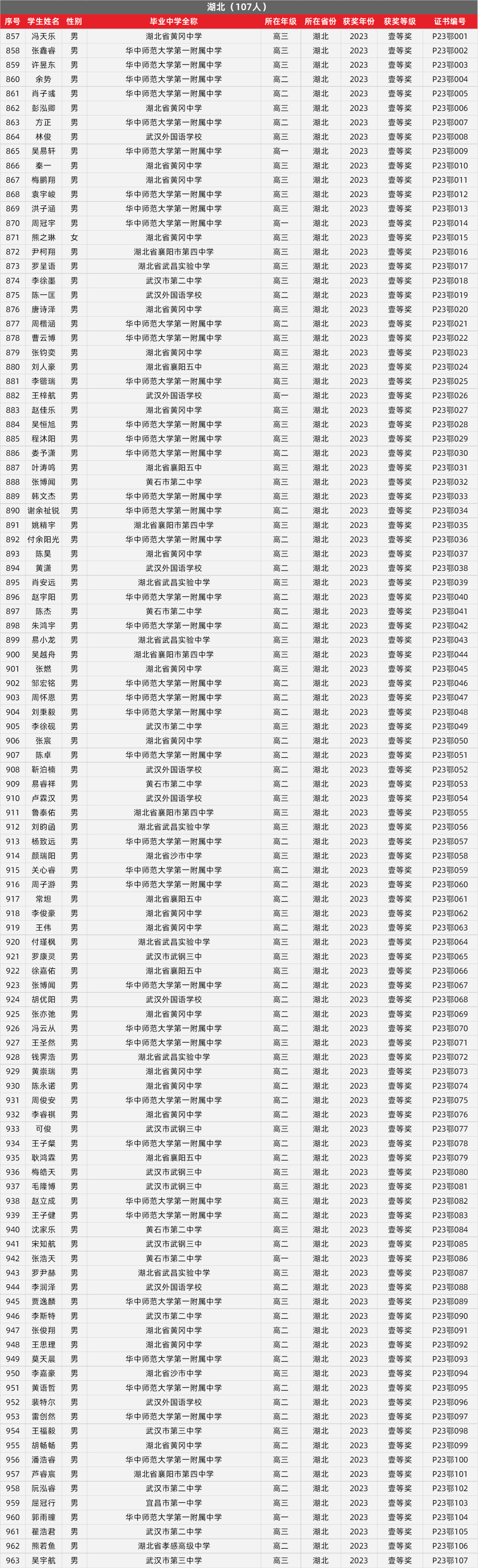 13. 湖北物理竞赛获奖名单