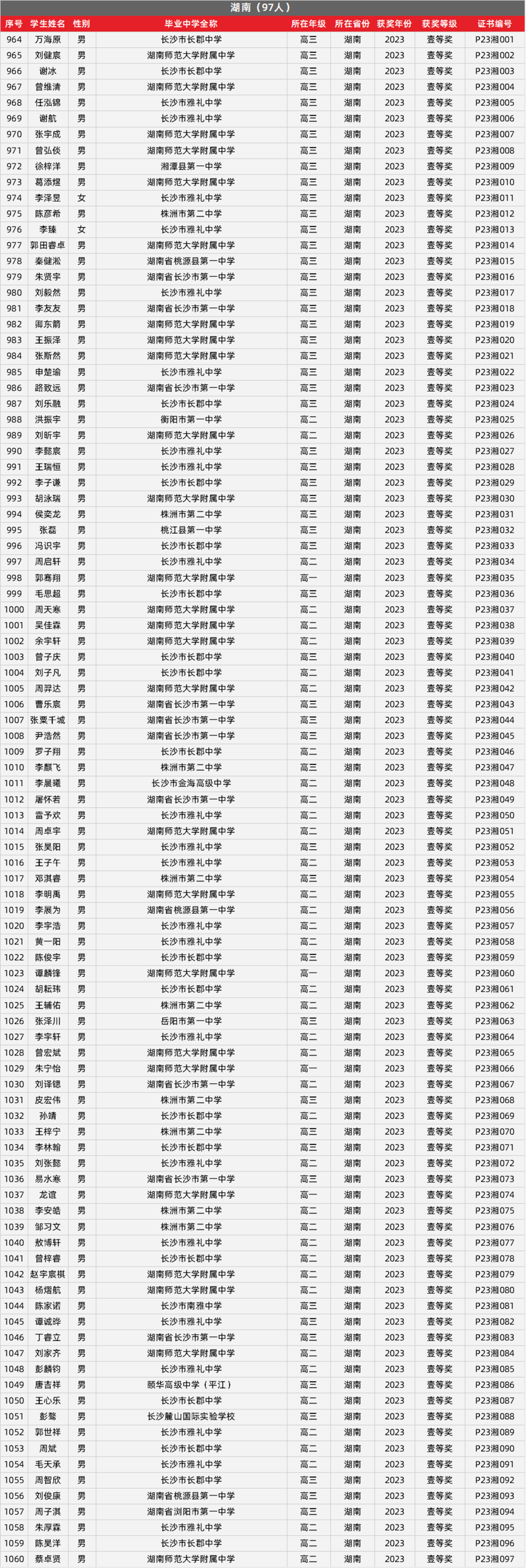 14. 湖南物理竞赛获奖名单