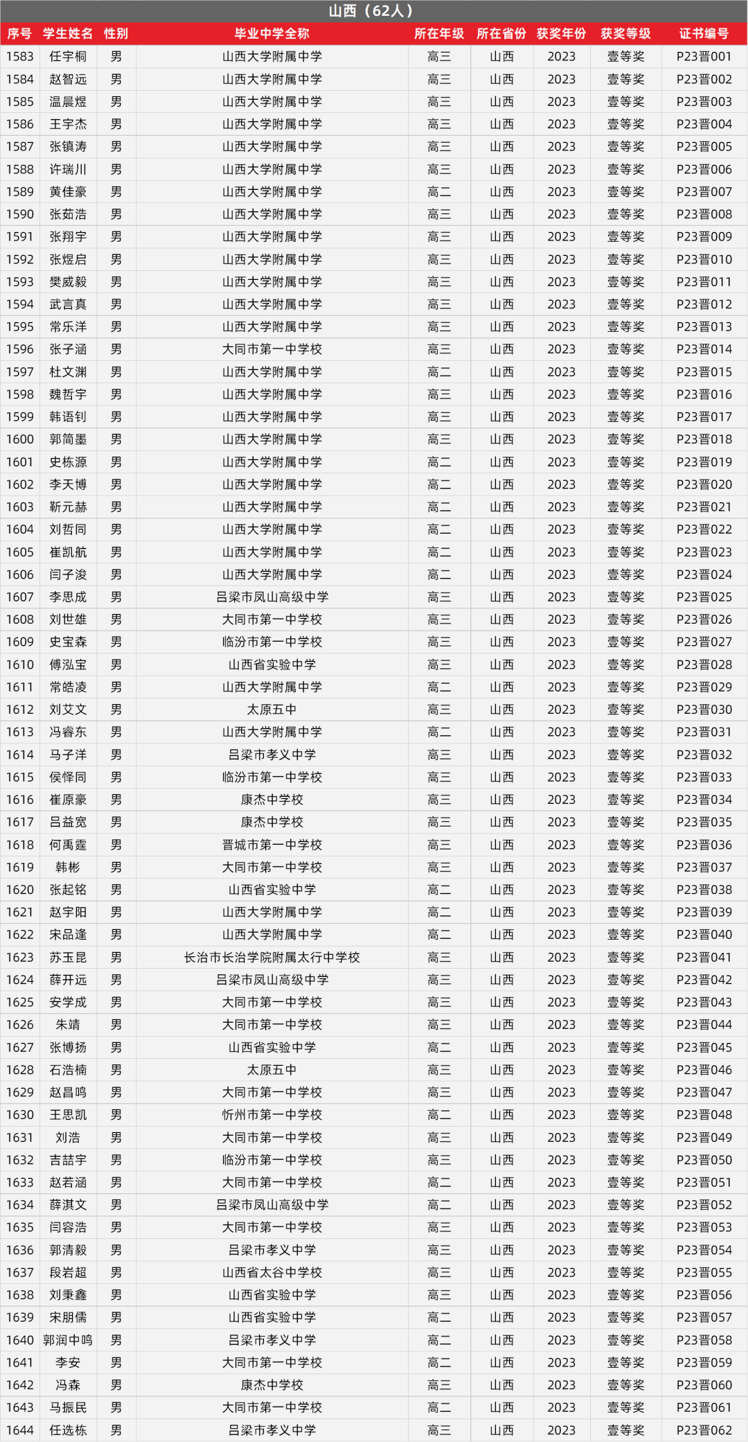 22. 山西物理竞赛获奖名单