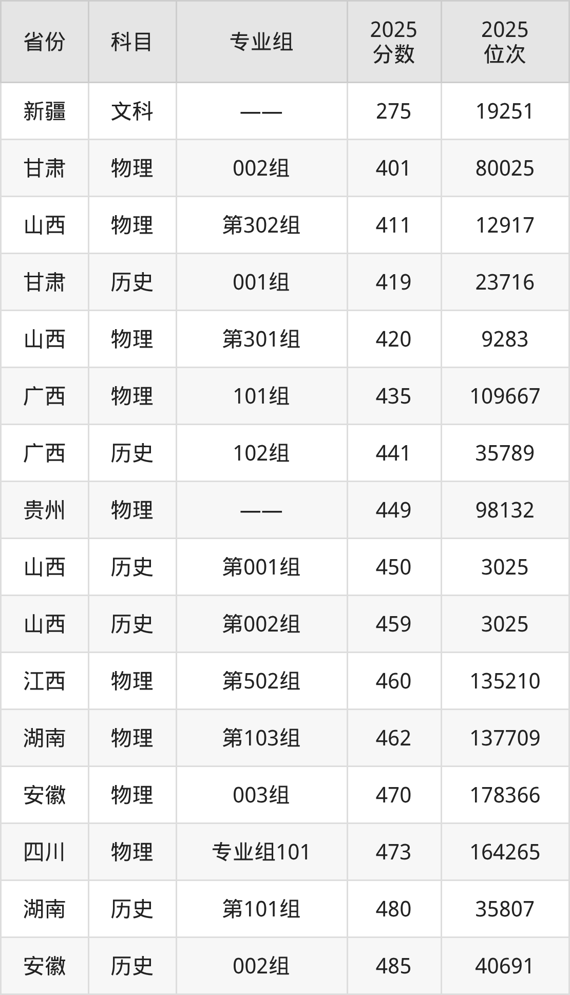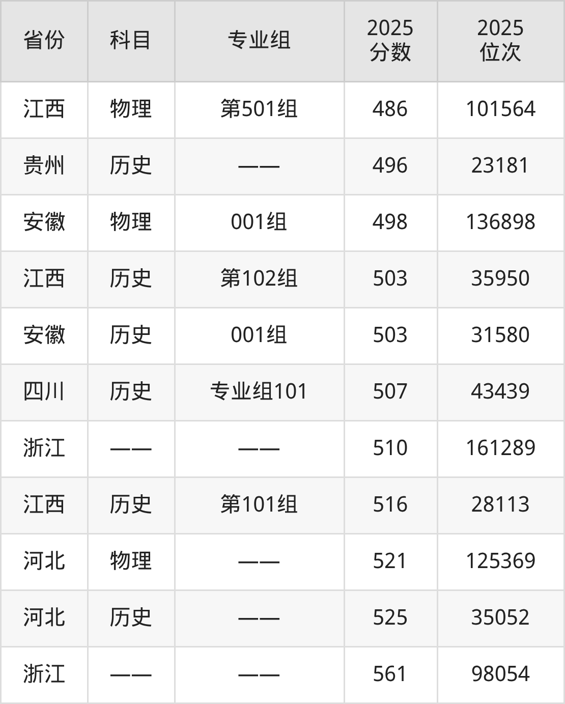 物理类:2025年金华职业技术大学录取最低分是401分(甘肃),对应的位次排名是80025名。