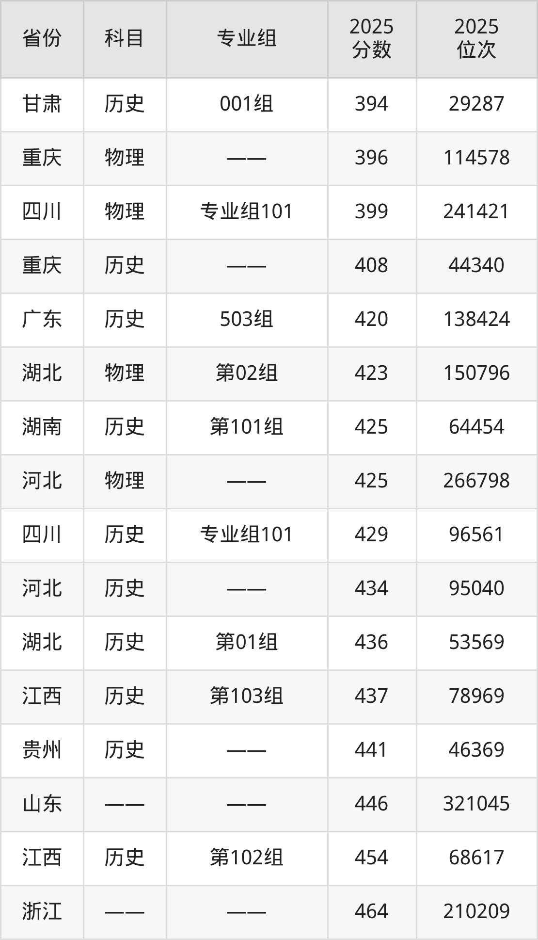 2025年江西司法警官职业学院全国排名第986位,2025年录取分数线最低314分(位次73352)。本文将展示江西司法警官职业学院在各省最低录取分数线汇总,供2026届想要报考该校的考生查阅。