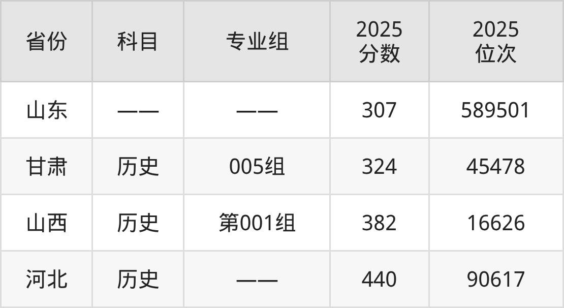 历史类:2025年山东特殊教育职业学院录取最低分是324分(甘肃),对应的位次排名是45478名。