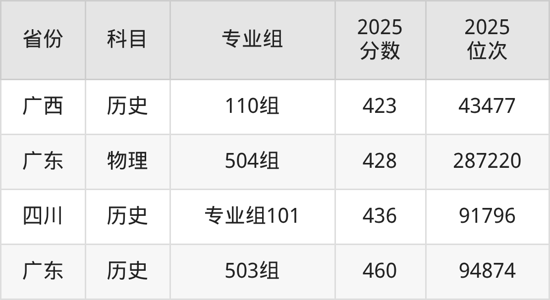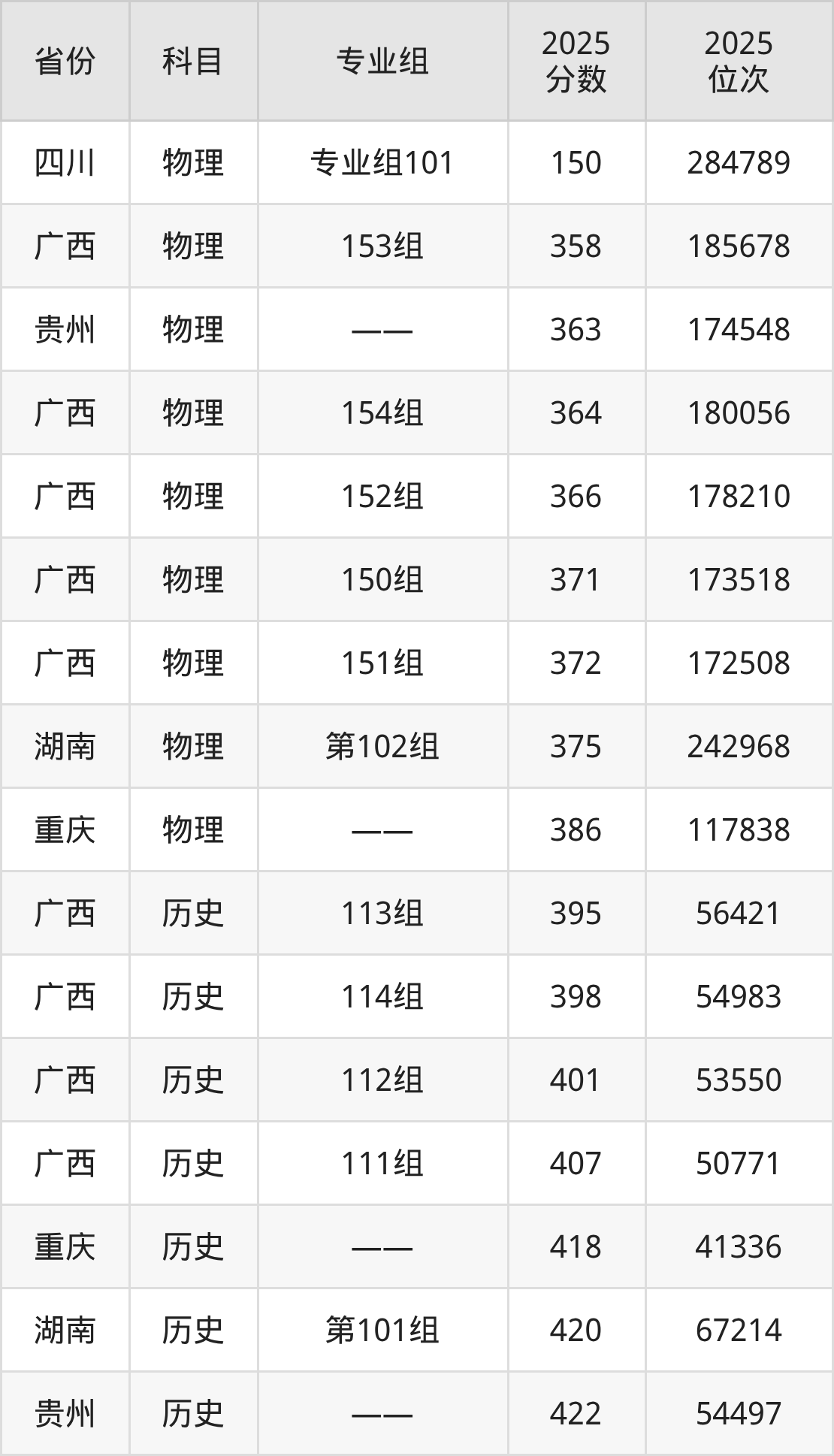 物理类:2025年广西卫生职业技术学院录取最低分是150分(四川),对应的位次排名是284789名。
