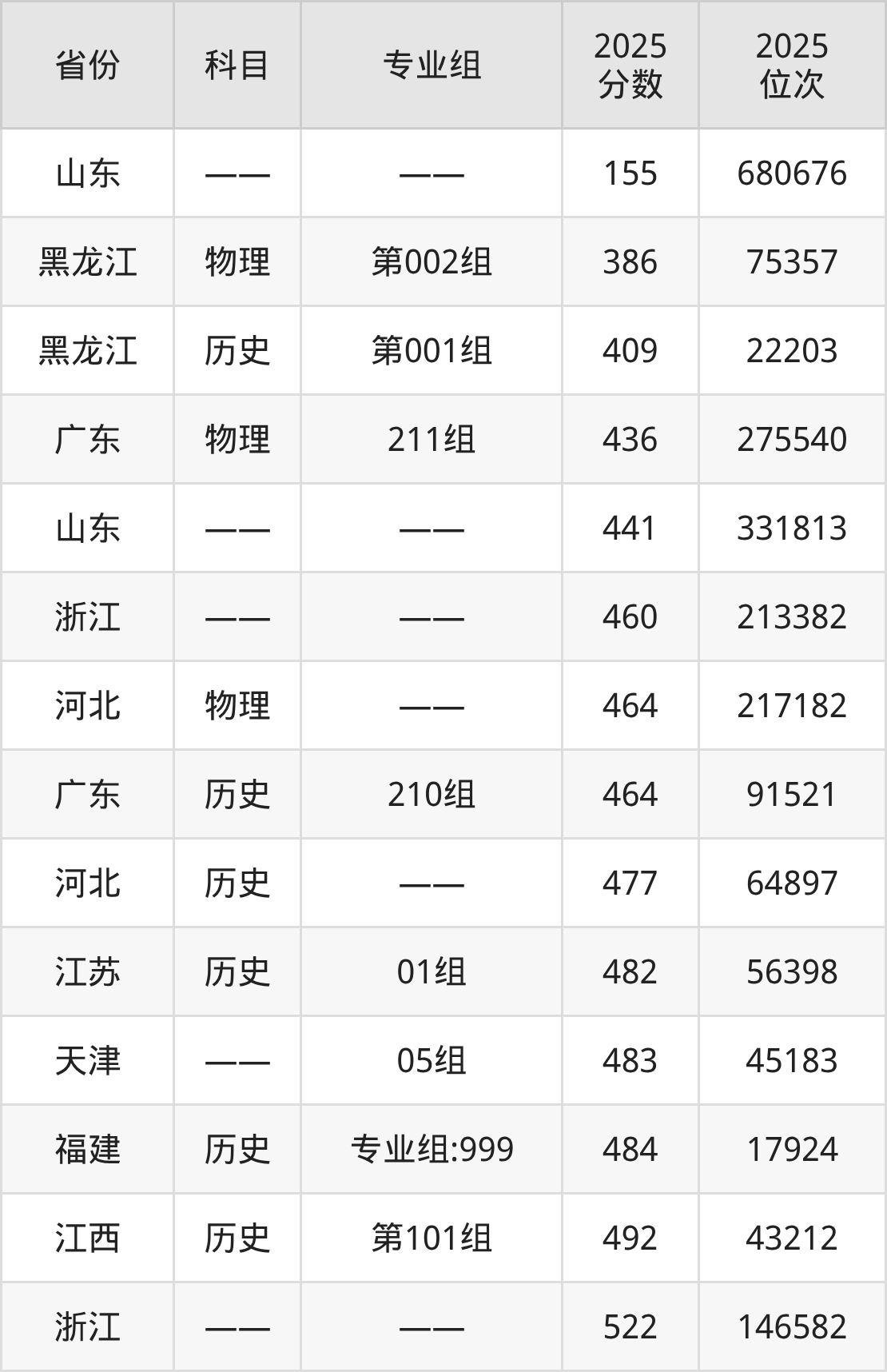 青岛电影学院2025年录取分数线最低155分(位次680676)。本文将展示青岛电影学院在各省最低录取分数线汇总,供2026届想要报考该校的考生查阅。