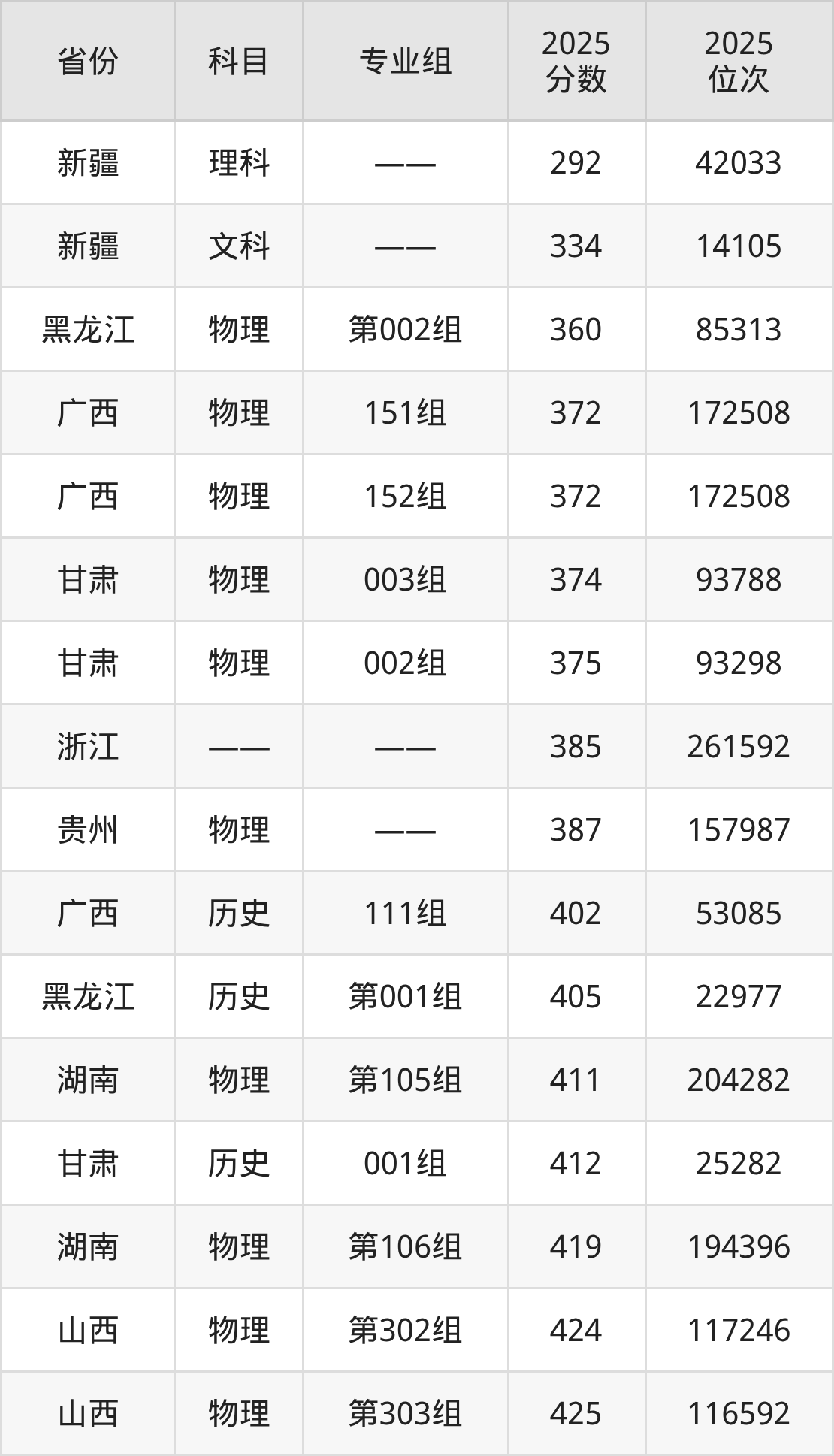 2025年浙江越秀外国语学院全国排名第712位,2025年录取分数线最低292分(位次42033)。本文将展示浙江越秀外国语学院在各省最低录取分数线汇总,供2026届想要报考该校的考生查阅。