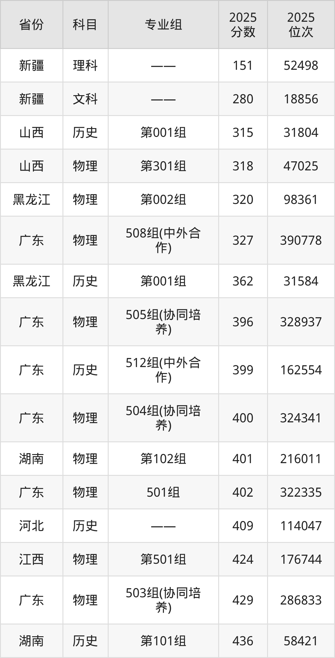 理科:2025年广东科贸职业学院录取最低分是151分(新疆),对应的位次排名是52498名。