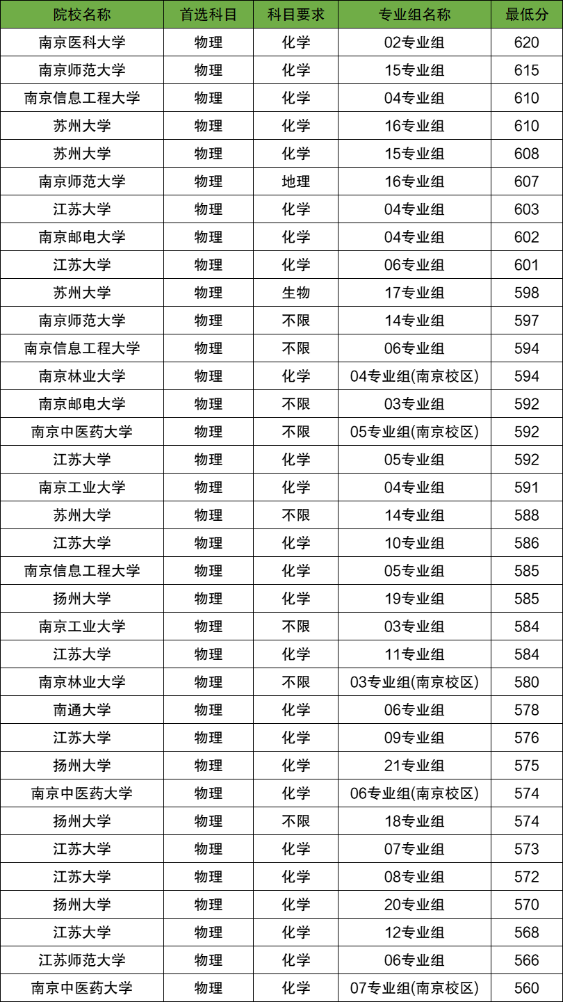 物理类:最低分专业组为07专业组(南京校区),分数是560,要求选化学。