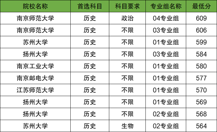 历史类:最低分专业组为01专业组,分数是580,不限选科要求。