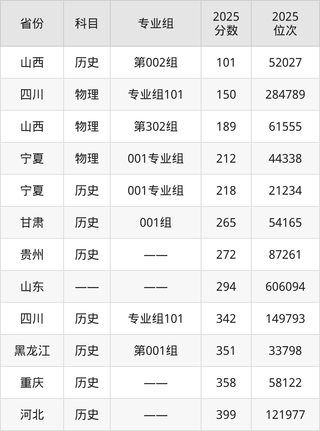 物理类:2025年阳泉师范高等专科学校录取最低分是150分(四川),对应的位次排名是284789名。