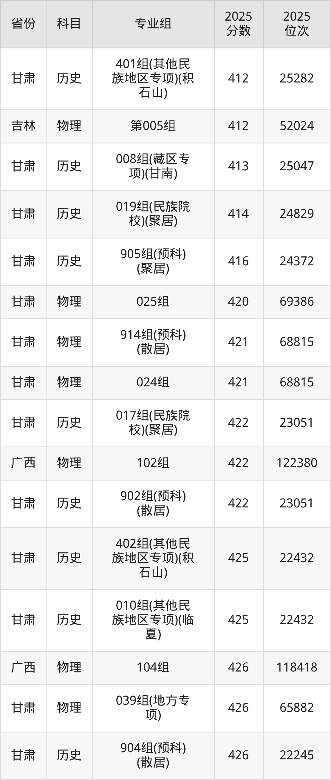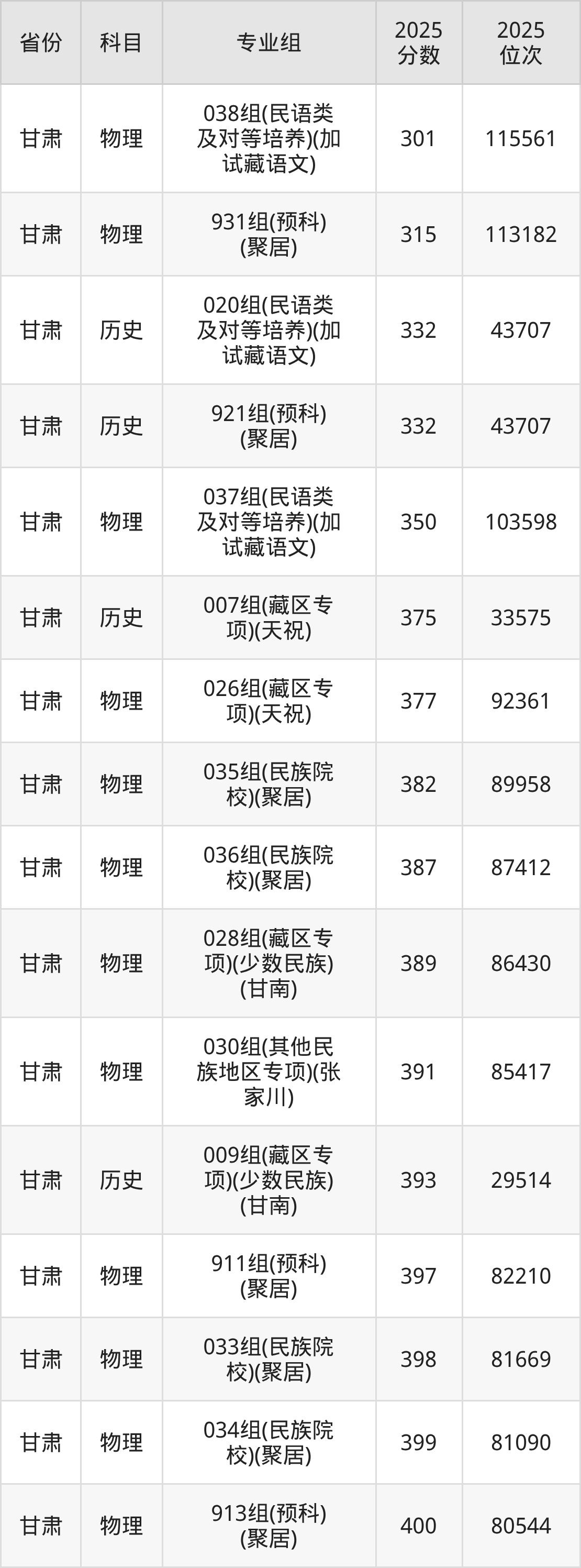 物理类:2025年甘肃民族师范学院省内录取最低分是301分,对应的位次排名是115561名。建议:如果2026年排名超过115561名,那么被该校录取的概率较大。